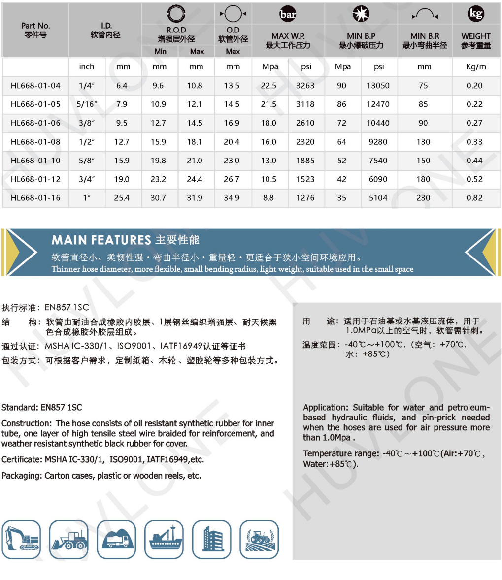 Product Usage:Application:Suitable for water and petroleum-based hydraulic fluids,and pin-prick needed when the hoses are used for air pressure more than 1.0Mpa.